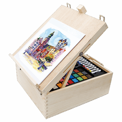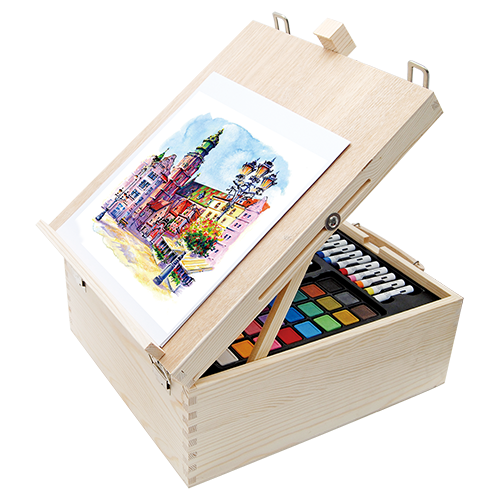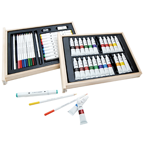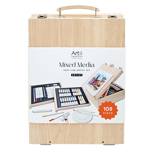 108PC Mixed Media Set Includes: 24 watercolor cakes, 12 colored pencils, 12 oil pastels, 12 acrylic paints – 12ml, 12 watercolor paints – 12ml, 10 dual-tip markers, 5 paint brushes, 1 sketching pencil, 1 palette knife, 1 eraser, 1 sharpener, 1 palette, 10 watercolor paper sheets – 8x10in, 5 drawing pencil sheets – 8x10in,1 wooden easel box