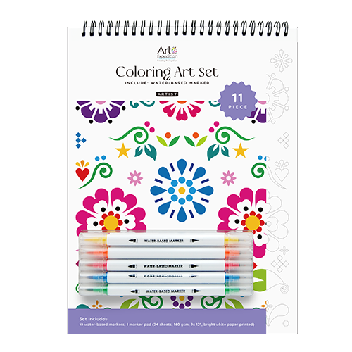 11PC Marker Coloring Set Includes: 10 double headed water-based markers, 1 coloring book (9×12”, 24 sheets,160gsm)