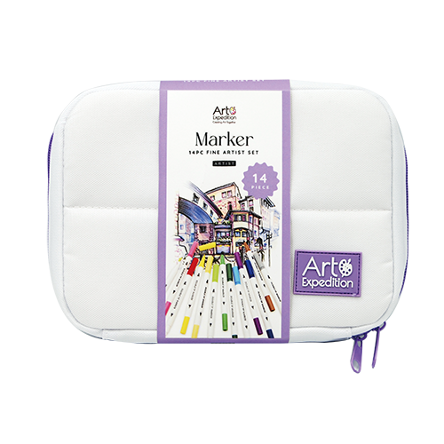 14PC Marker Set Includes: 12 dual-tip water-based markers, 1 fine liner pen, 1 grid carrying bag