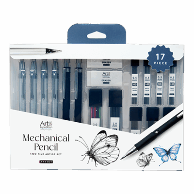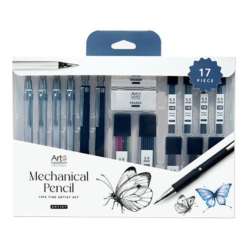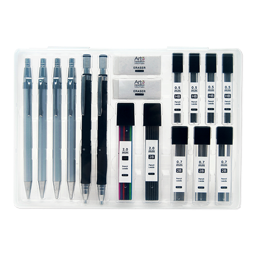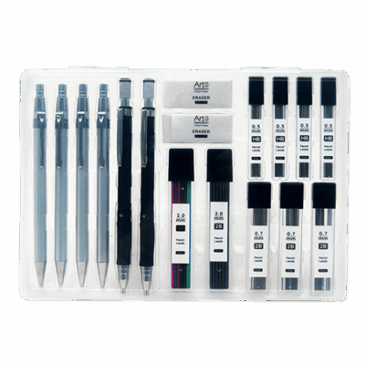 17PC Mechanical Pencil Set Includes: 2 mechanical pencil 0.5, 2 mechanical pencil 0.7, 2 mechanical pencil 2.0, 4 pack of 12pc HB pencil lead 0.5, 3 pack of 12pc 2B pencil lead 0.7, 2 pack of 12pc colored pencil lead 2.0, 2 erasers, 1 plastic box