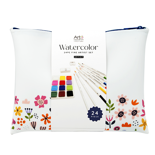 24 PC Watercolor Set Includes: 12 2×2 square watercolor cakes, 6 watercolor pencils, 2 golden synthetic brushes, 1 sketching pencil, 1 pencil, 1-hole plastic sharpener, 1 eraser, 1 silicone bag