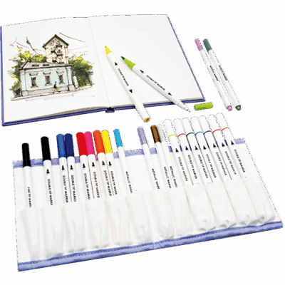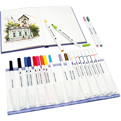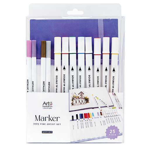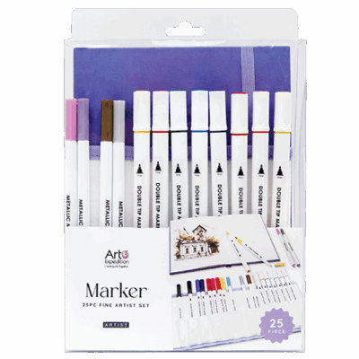 25PC Marker Set Includes: 8 dual tip water-based markers, 8 brush markers, 6 metallic markers, 1 storage case, 1 fine liner, 1 journal book (5.7*8.26”, 60 sheets, 75gsm marker paper)