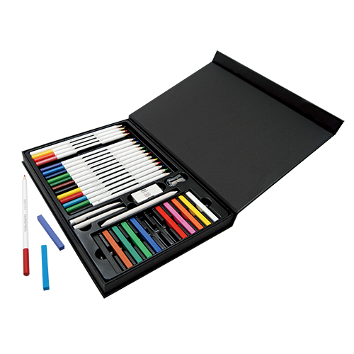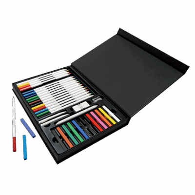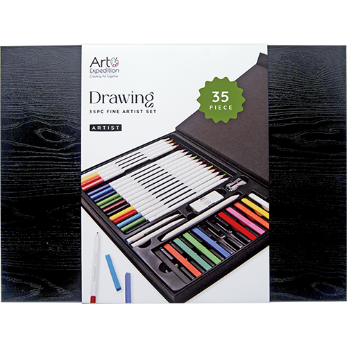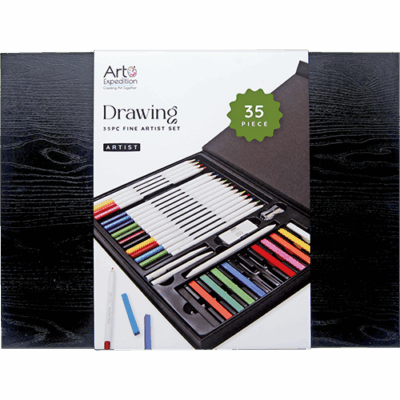 35PC Drawing Set Includes: 12 colored pencils. 12 soft pastels, 4 fluorescent pencils, 2 tortillons, 1 sketching pencil, 1 sharpener, 1 vinyl eraser, 1 blending stump, 1 storage box