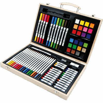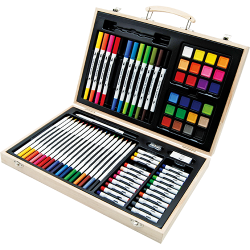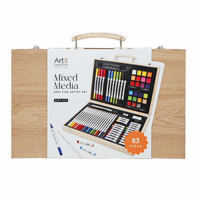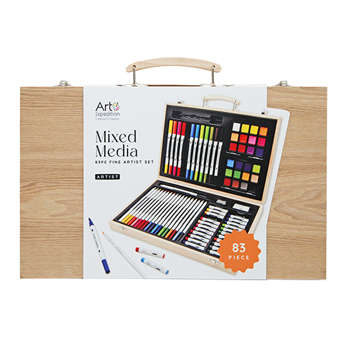 83PC Mixed Media Set Includes: 24 watercolor cakes, 24 oil pastels, 18 colored pencils, 12 dual tip markers, 1 golden synthetic brush, 1 sketching pencil, 1 vinyl eraser, 1 sharpener, 1 wooden box